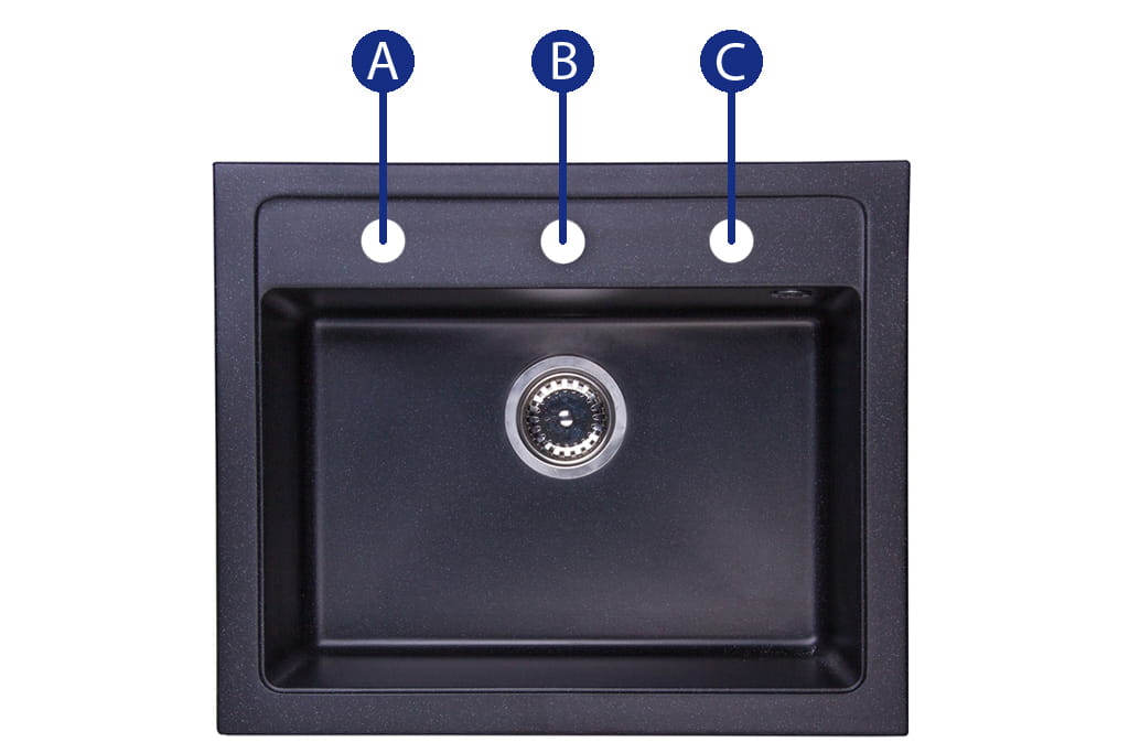 - zlewozmywak sprzedawany jest z otworem po środku B. Dodatkowo możemy wykonać otwór w miejscu A i C. Przy zakupie prosimy w uwagach wpisać wymagane otwory.
