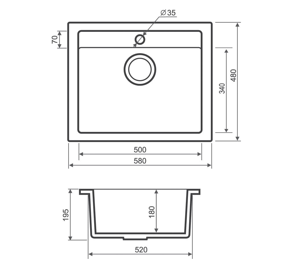 Montaż na szafce lub do wpuszczenia w blat. Zlew przeznaczony jest do montażu poprzez wpuszczenie w blat lub na szafce (minimalna szerokość szafki 60 cm).