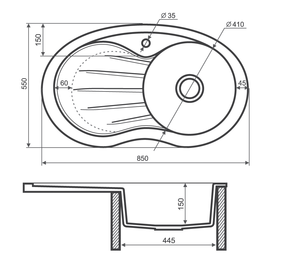 - zlewozmywak sprzedawany jest bez otworów, możliwość wykonania otworów na życzenie - otwór A - bateria, otwór B - pokrętło do syfonu automatycznego - napisz w uwagach przy zakupie zlewozmywaka