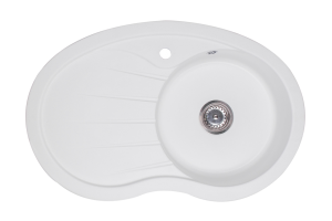 Biały zlewozmywak granitowy 85x55 cm jednokomorowy Darfor. Zlewozmywak kuchenny granitowy posiada okrągłą komorę z praktycznym ociekaczem. Zlewozmywak wyróżnia się fantazyjnym kształtem i nowoczesnym designem. Subtelny, biały kolor, sprawia, że zlewozmywak jednokomorowy doskonale komponuje się z każdą kuchenną aranżacją, której dodaje powiewu świeżości i delikatności.