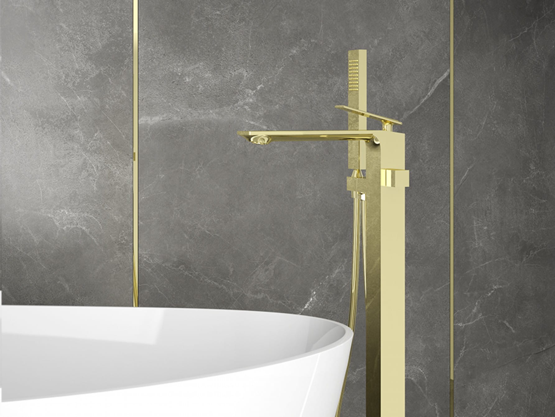 Bateria wolnostojąca wannowa występuje w luksusowym, złotym kolorze. Dostępna jest również w kolorze chrom, grafit oraz chrom połysk.