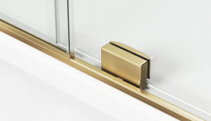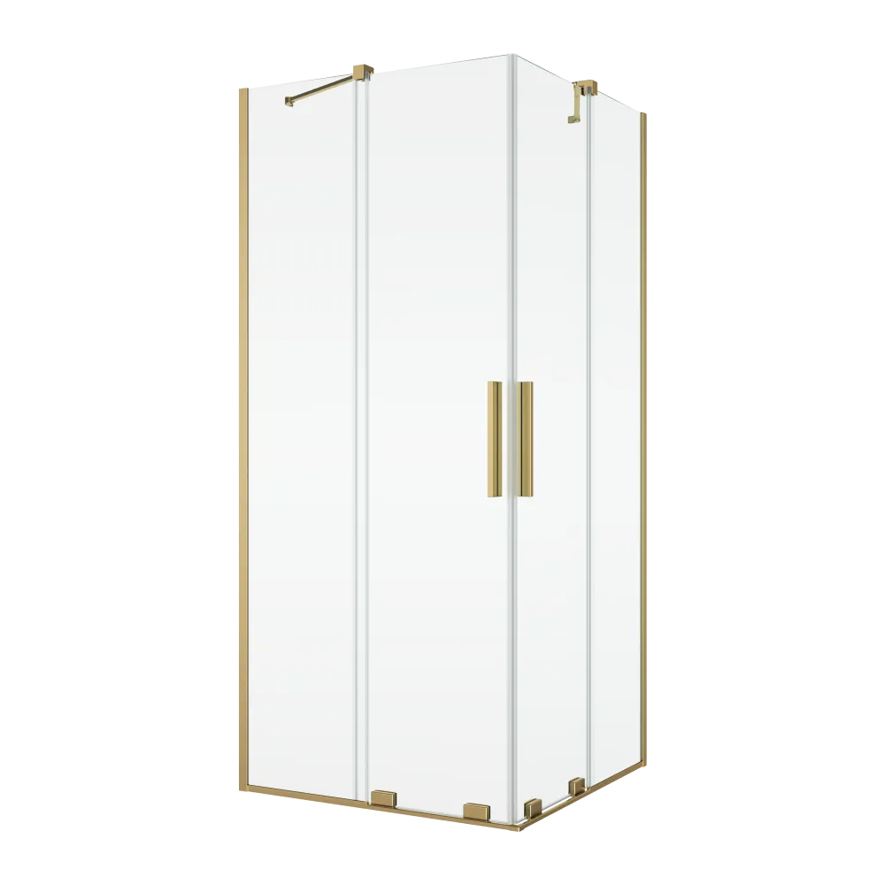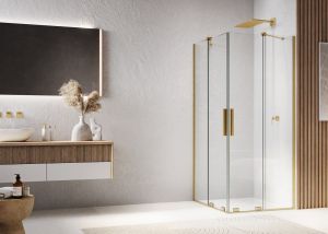 Kabina prysznicowa 120x120 cm ze złotymi, szczotkowanymi elementami. Kabina natryskowa Amalia z przesuwanymi drzwiami i narożnym wejściem to nowoczesne rozwiązanie, które łączy elegancki design z subtelnością. Szczotkowane, złote elementy konstrukcji nadają jej nowoczesny i ekskluzywny wygląd. Kabina doskonale wkomponuje się w każde wnętrze łazienki, bez względu na styl. Dostępna jest w wielu rozmiarach oraz z profilami w kolorze srebrnym połysku i czarnym matowym.